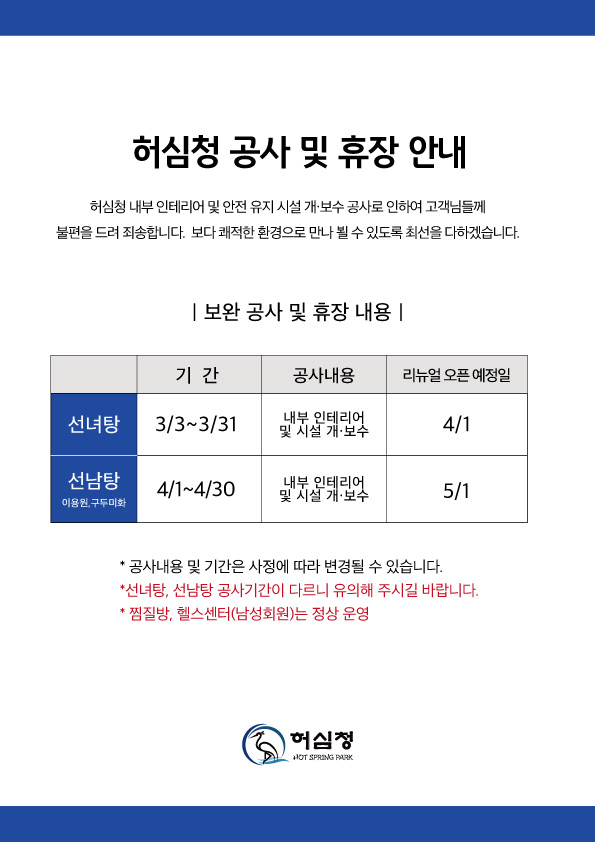 허심청 2026 허심청 공사 안내 호텔농심 2025. 12. 29. 08:51 공유하기 게시글 관리 호텔농심 '허심청' 카테고리의 다른 글 허심상 소개 (1) 2024.10.23 '허심청' Related Articles 허심상 소개